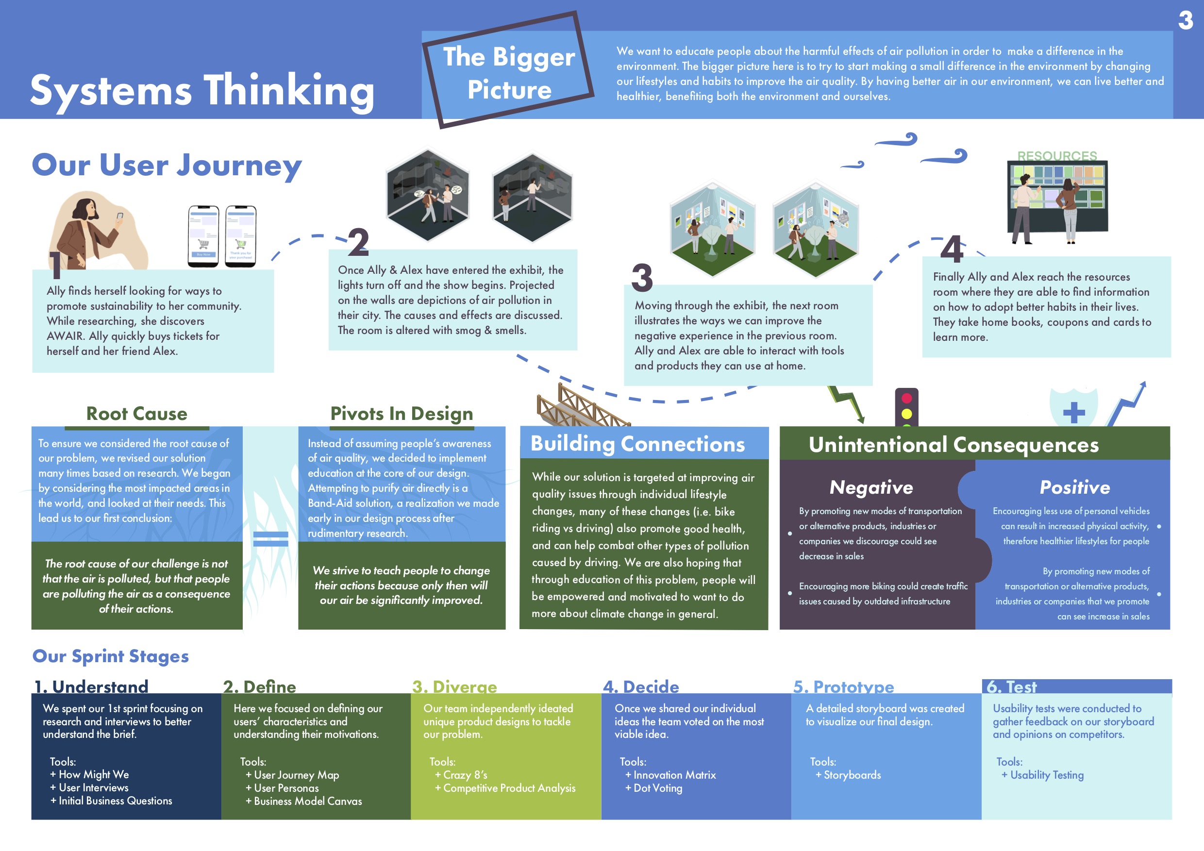 This sprint illustrates our understanding of the brief, the problem we wanted to explore (air quality & poor air quality in dense cities), and what we already understand about it (types of air pollution, the ways it affects people & solutions that already exist).